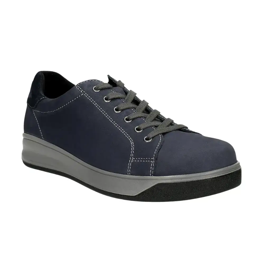 Celoroční diabetická obuv Milan, přírodní useň, šněrování, podešev - PUR/TPUR odpružená s protiskluzem, barva modrá a šedá.