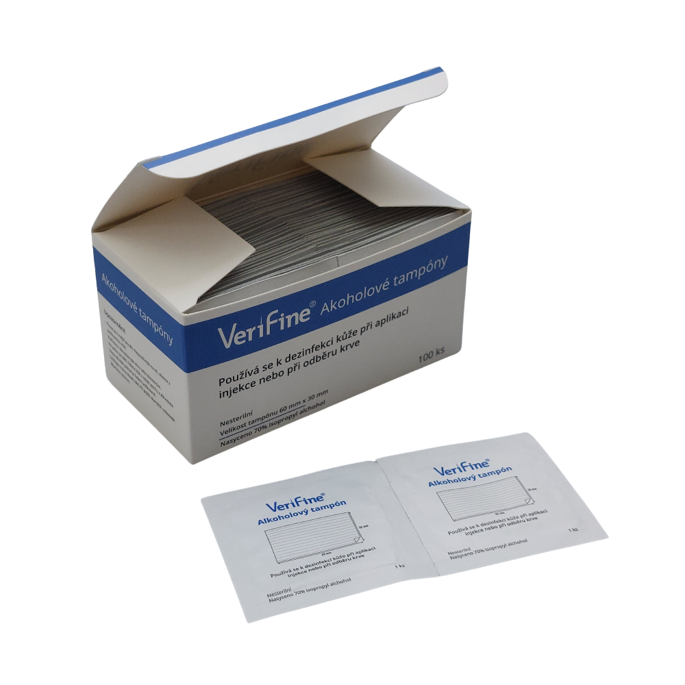 Tampony jsou nasyceny 70% isopropyl alkoholem a jsou baleny jednotlivě. Vnitřní strana balení je opatřena hliníkovou fólií, která zabraňuje vysychání. Rozměr jednoho tamponu je 60 mm x 30 mm. Tampony se hodí i jako dezinfekce na cesty, nehrozí rozlití, jsou lehké a nezabírají moc místa.