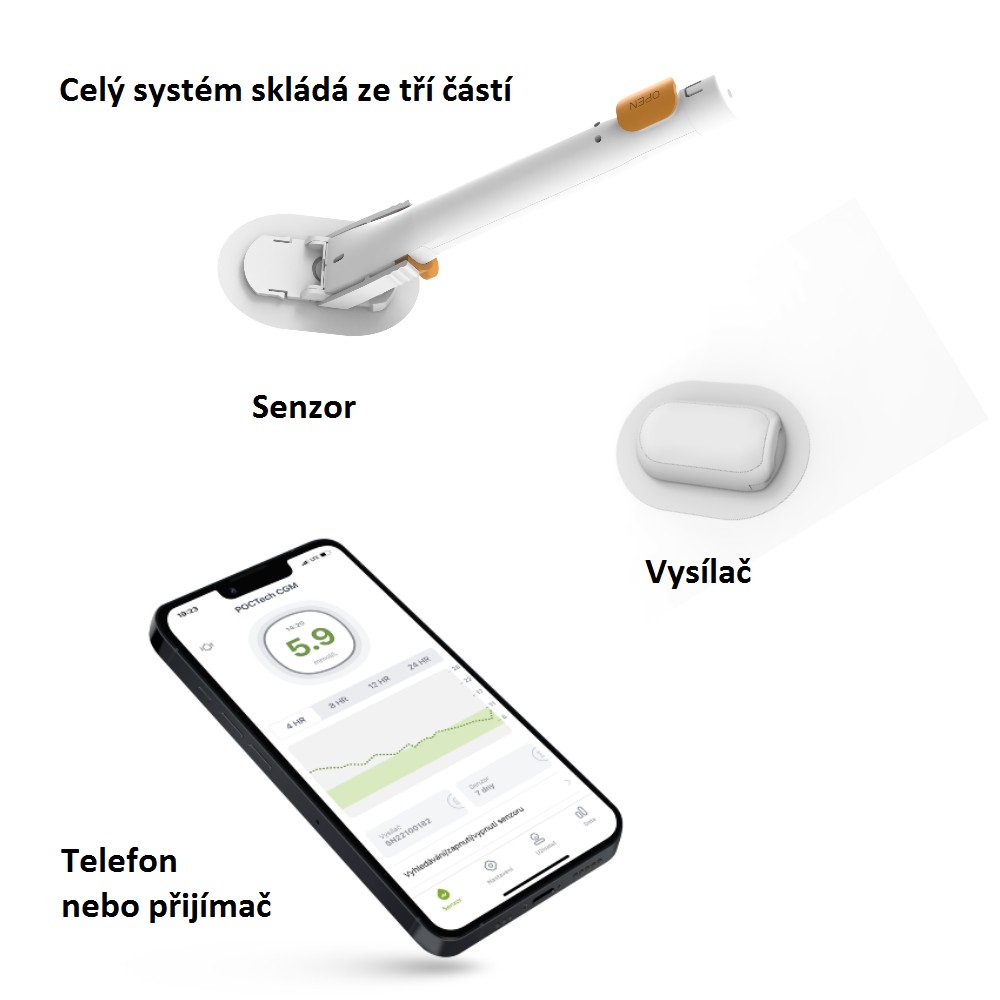 Systém POCTech na kontinuální monitorování cukru v krvi je komfortní, bezbolestný a diskrétní způsob jak nepřetržitě sledovat vývoj Vaší glykémie bez neustálého píchání do prstu. Celý systém se skládá ze senzoru, vysílače a přijímače.