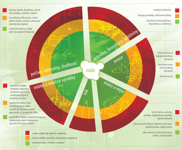 Následující obrázek ukazuje, které potraviny jsou pro Vás ty vhodné (označené zeleně) a které jsou vyloženě nevhodné (označeny červeně). Jednotlivé výseče pak ukazují, jaké procentní zastoupení by měly mít jednotlivé skupiny v celodenním příjmu potravy.
