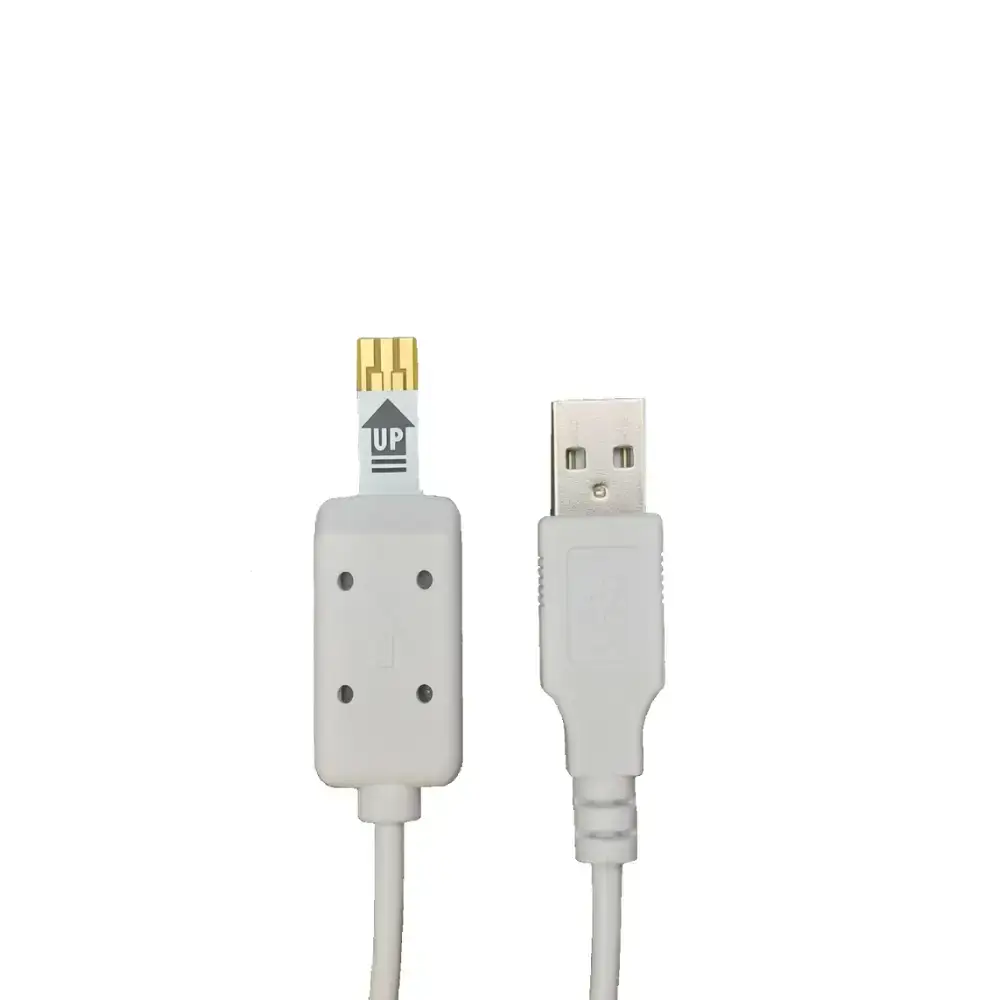 Pokud si přejete stáhnout výsledky měření z glukometru do PC pomocí kabelu, je potřeba si přikoupit speciální kabel. Plochá část kabelu se zasune do portu na testovací proužky glukometru vyznačenou šipkou směrem vzhůru. Druhý konec kabelu se připojí do USB počítače.